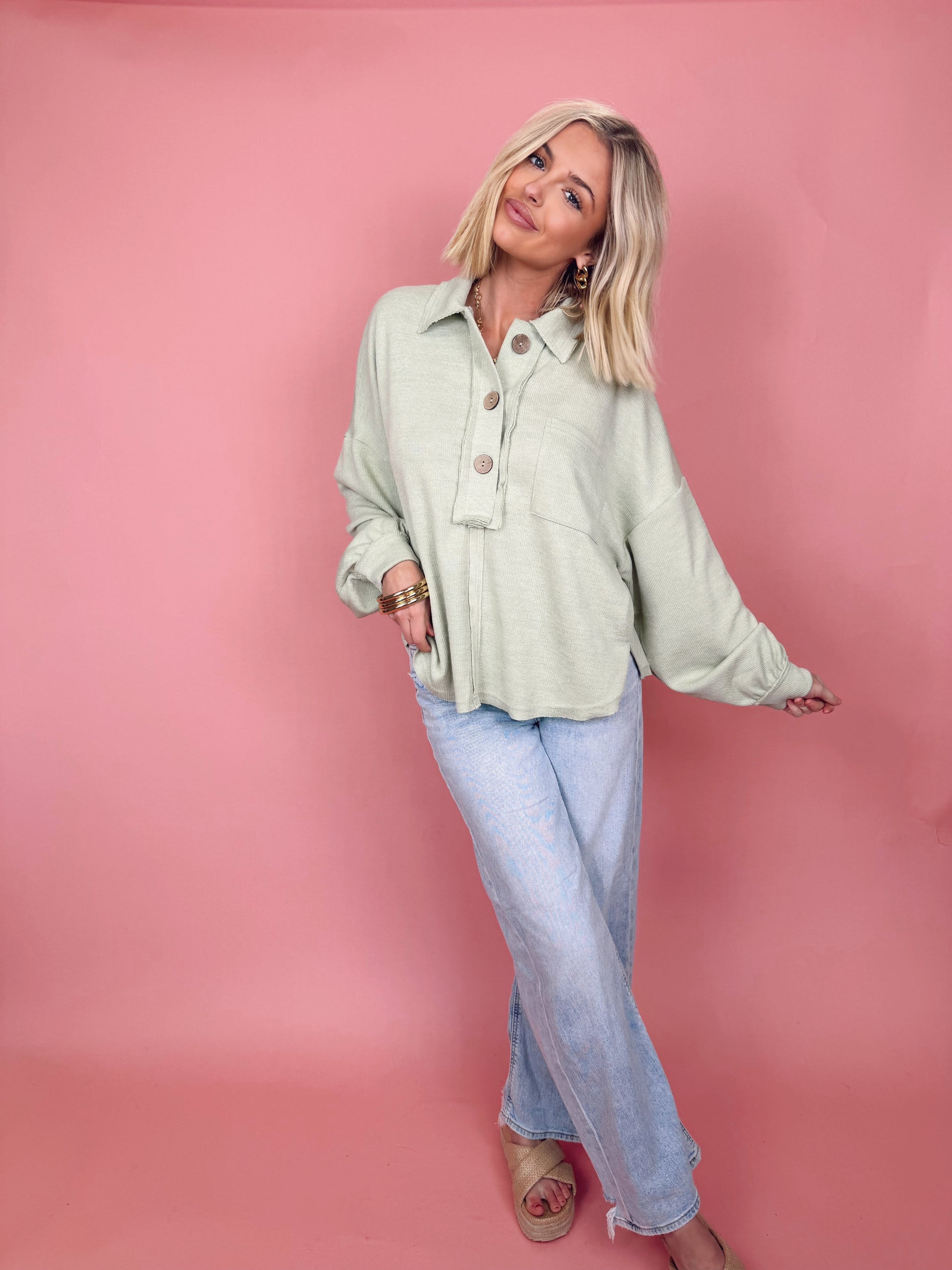 collared split neck button down chunky button extended shoulder long sleeves relaxed fit raw edge