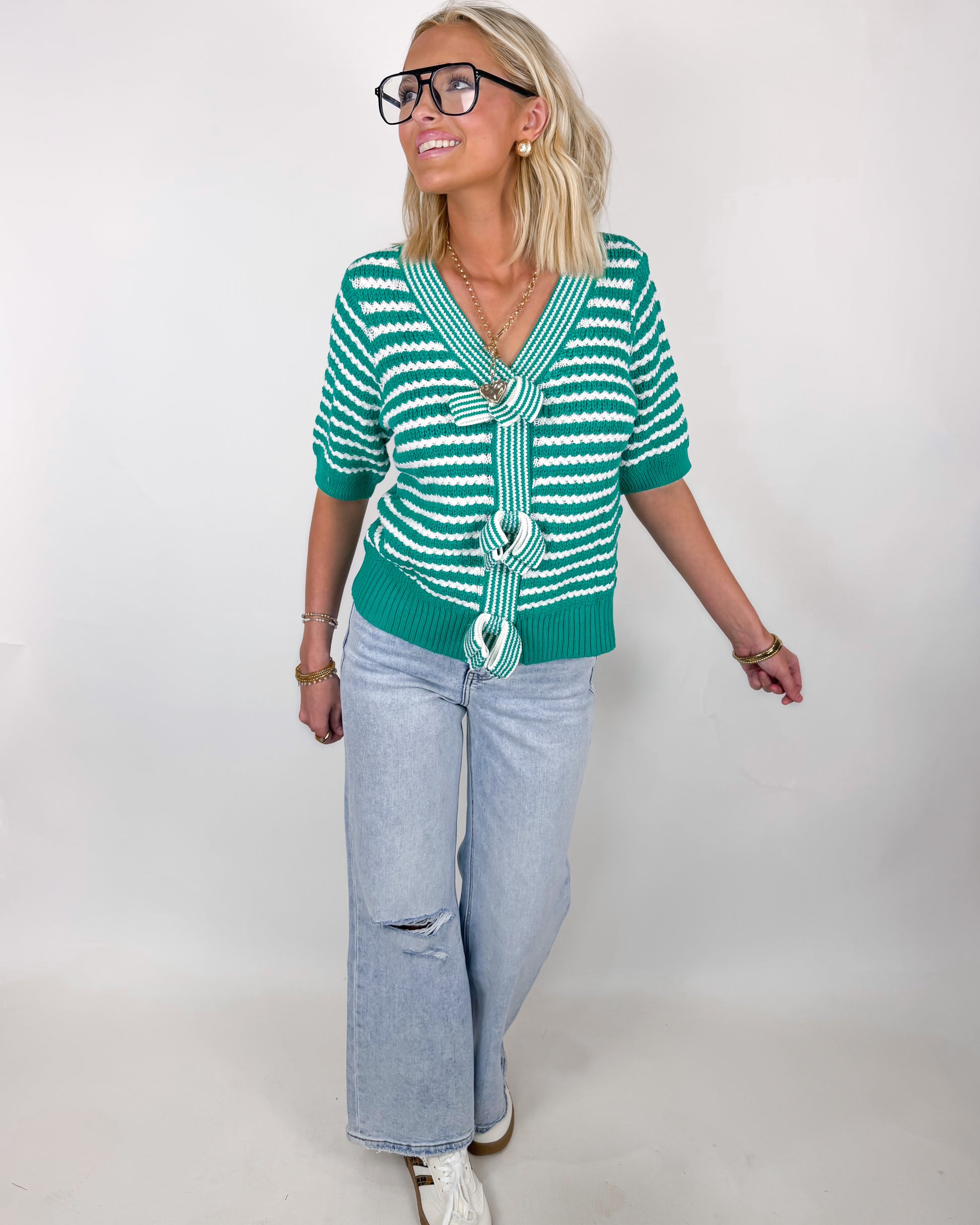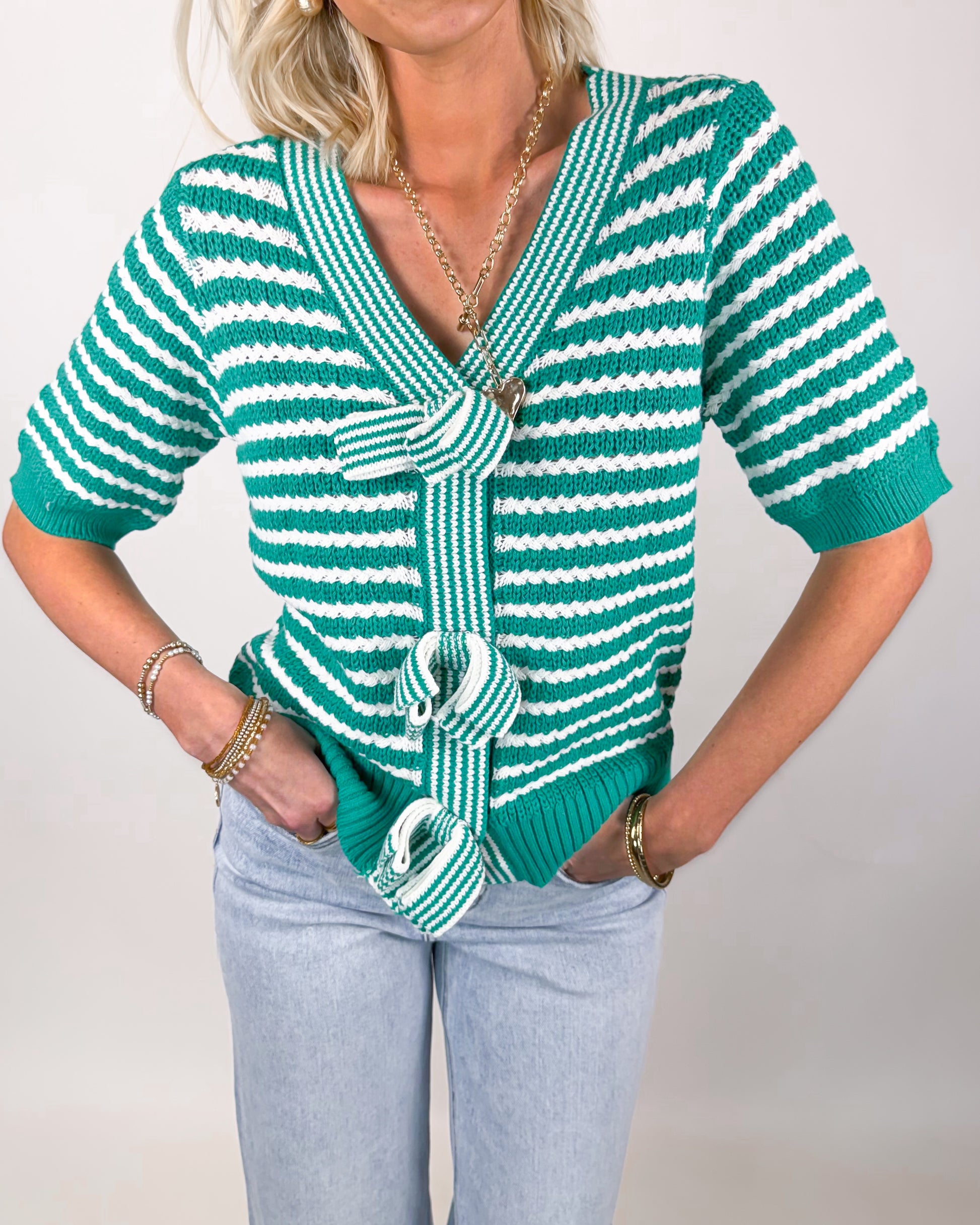 Charming bow knot detail at the front creates a unique, highly feminine focal point. Classic striped knit offers a sophisticated texture that maintains a soft, comfortable feel. Contrast trimming along the edges and V-neckline adds a sharp, polished, and tailored finish. Short-sleeve silhouette makes this an ideal piece for transitioning between seasons or layering under jackets.