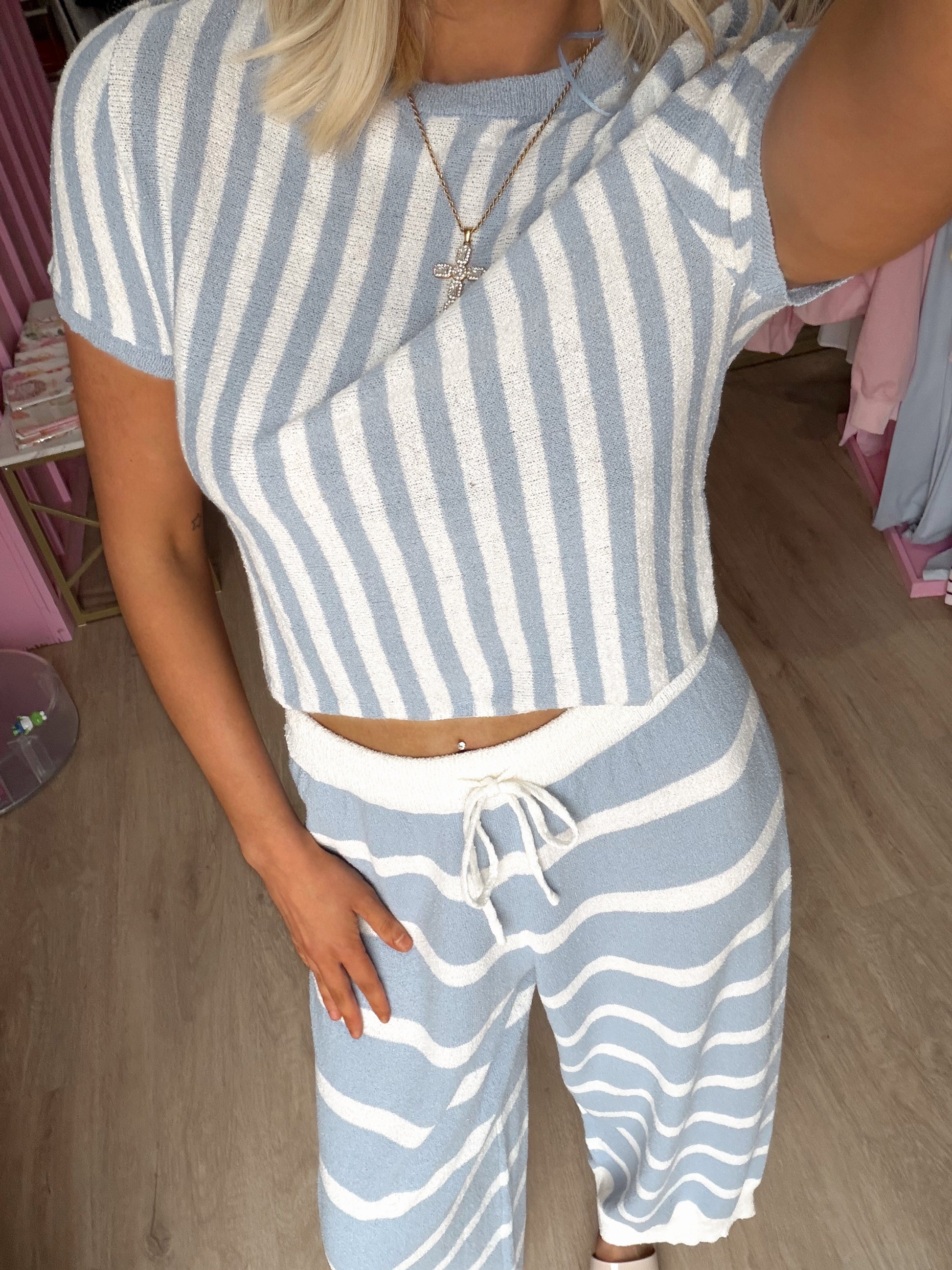 Short sleeves top and pants sweater set 100% polyester